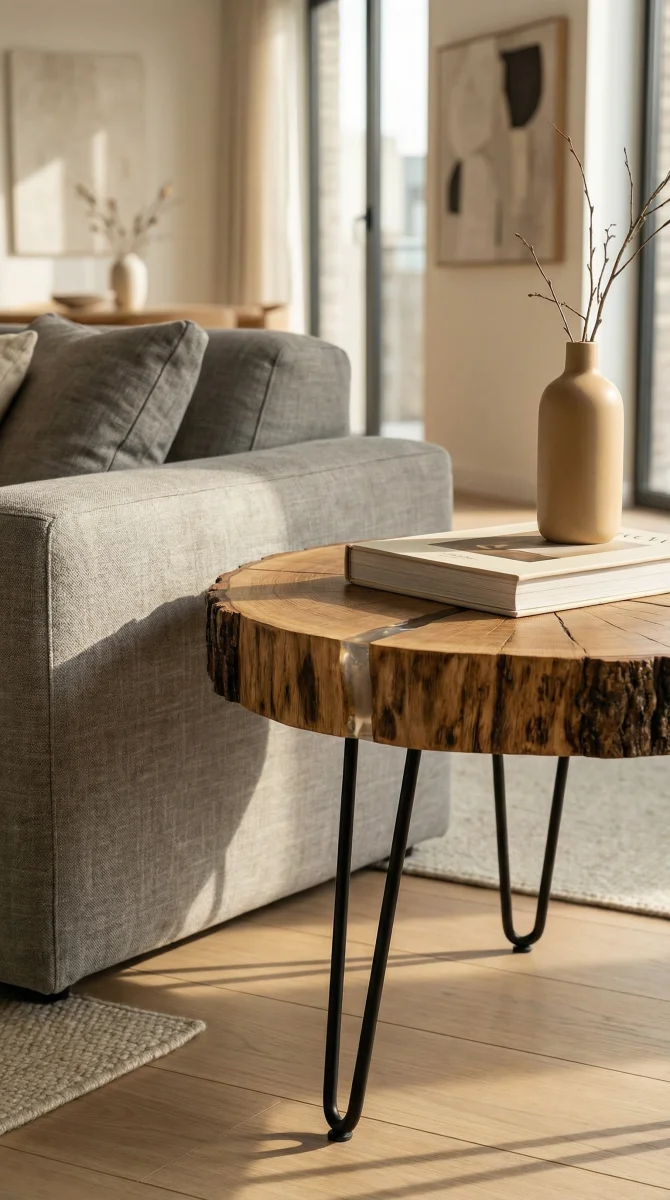 Журнальный стол из спила векового дуба. Уникальный рисунок годовых колец дополнен прозрачной смолой. Покрытие маслом-воском сохраняет тепло дерева. Стильный арт-объект для уюта в вашем лофт-интерьере.