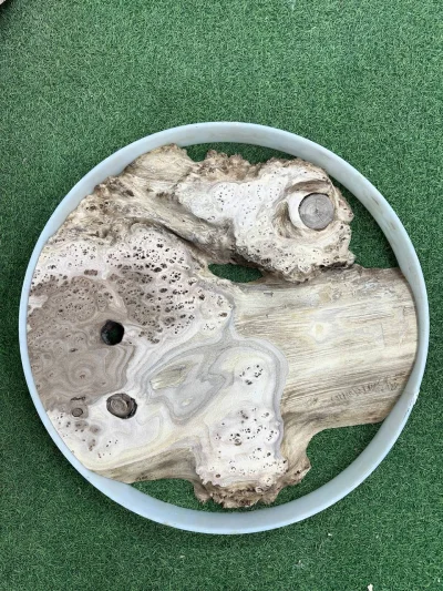 Этот спил карагача словно картина, созданная самой природой. Светлые, кремовые оттенки переплетаются с серыми прожилками, образуя неповторимый рисунок. Отверстия и замысловатые формы добавляют ему особого шарма. Представьте его в качестве оригинального панно, которое станет центром внимания в вашем интерьере.